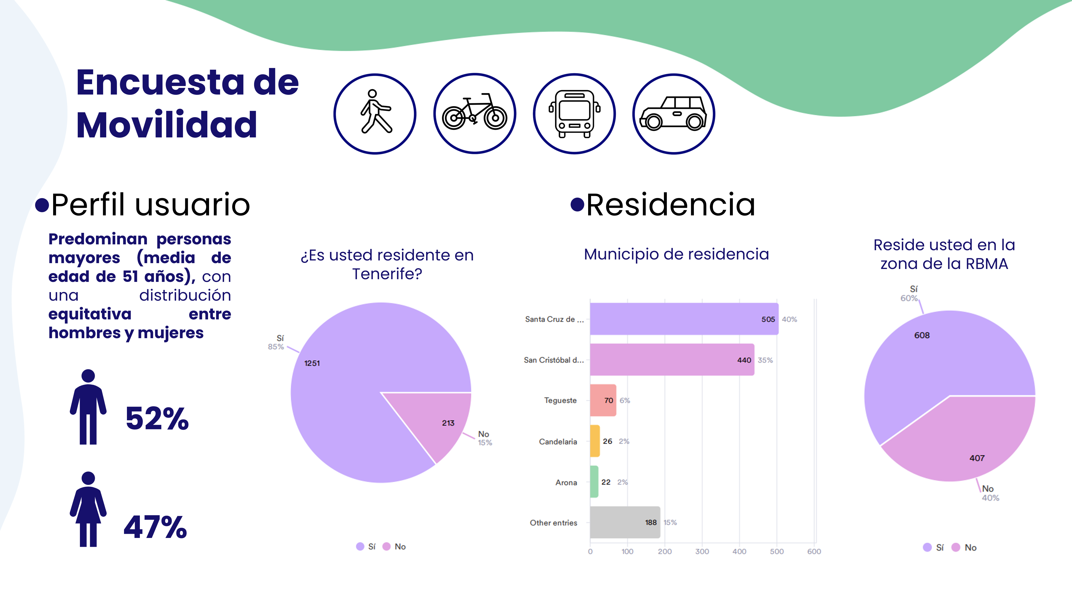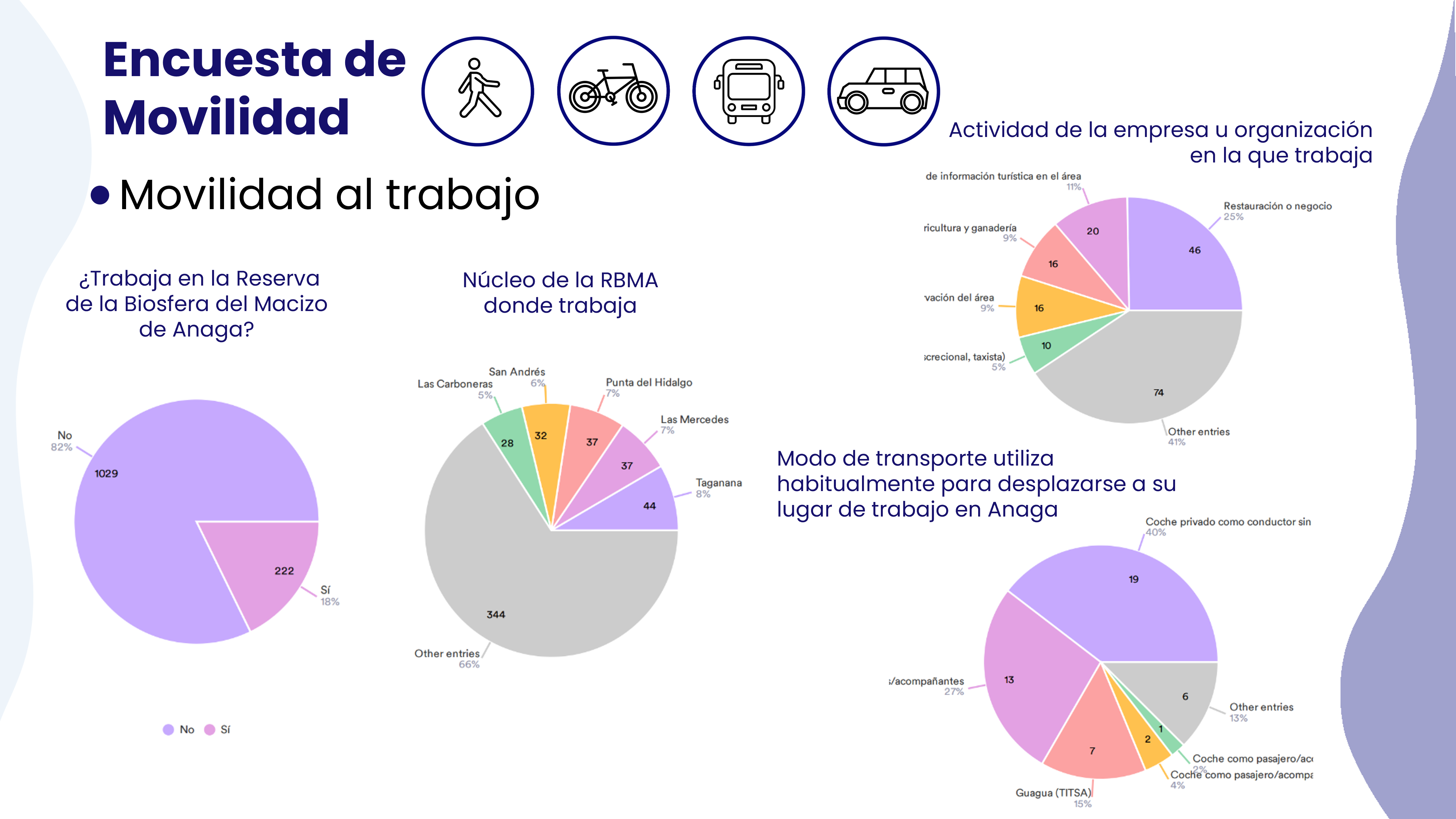 En colaboración con la Universidad de La Laguna (ULL), durante el 2024 se llevó a cabo una encuesta para analizar los patrones de movilidad en la Reserva de la Biosfera del Macizo de Anaga (RBMA). Este estudio permitió identificar hábitos de desplazamiento, percepciones sobre el tráfico y evaluar posibles mejoras en la gestión de la movilidad.